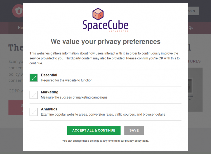 This format is arguably the most compliant as it ensures the user has made a choice before proceeding, and ensures they are able to do so at a granular level. - Accept All / Blanket Consent
